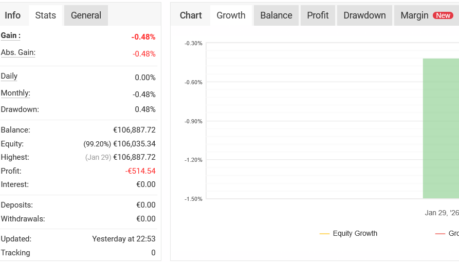 Sehr geehrtes Robotrading Mitglied, unser Roboter konnte die letzte Woche mit einem schönen Gewinn von +1,97% abschließen und so seinen positiven Trend des letzten Jahres fortsetzen. Wir stehen direkt an der Schwelle zu Kontohöchstständen, die wir bereits in der vor uns liegenden Woche überschreiten könnten. Unser Roboter hat noch eine offene Position auf …